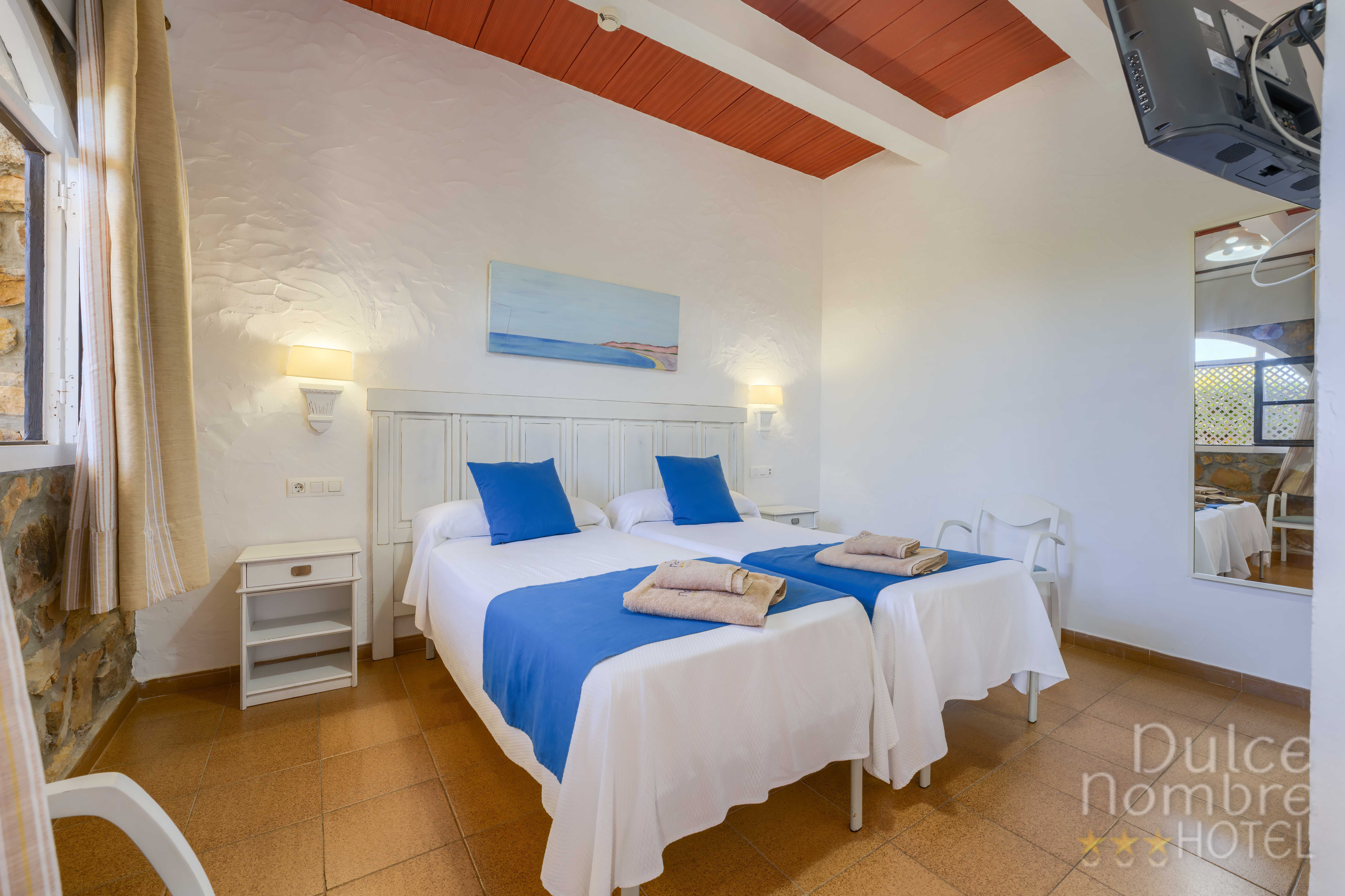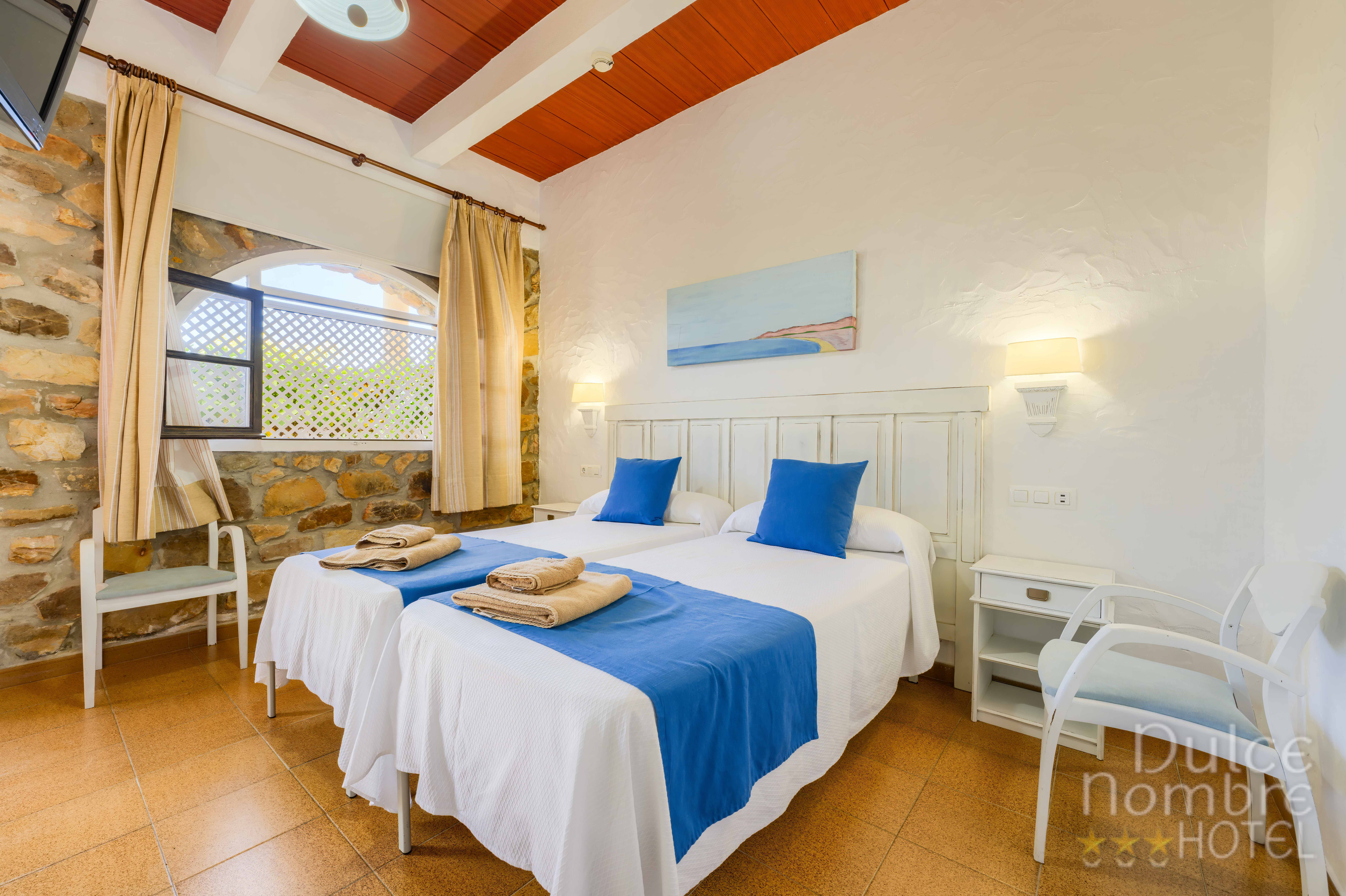 La mayoría de las habitaciones del Hotel Dulce Nombre*** ofrecen unas increíbles vistas a la playa, presentando todas ellas baño completo con bañera y ducha incorporada, aire acondicionado, Wifi Gratuito, TV con TDT, y teléfono con línea directa.